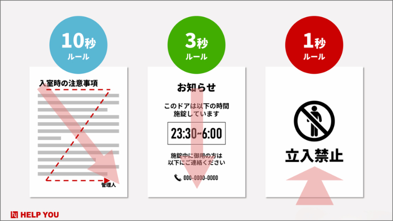 例えば、10秒くらいかけてしっかり読んで理解してほしいページなら、左上から右下に自然に目線が流れるレイアウトにする。3秒くらいで一読してほしいページなら、目線が1方向にスッと動く構図にする。1秒でパッと伝えたいページなら、1点に視線が集まる見せ方にする、という感じです。