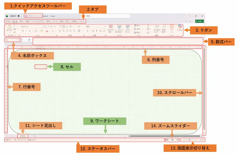 ワークシート内にある1つ1つのマス目のことを「セル」と呼びます。