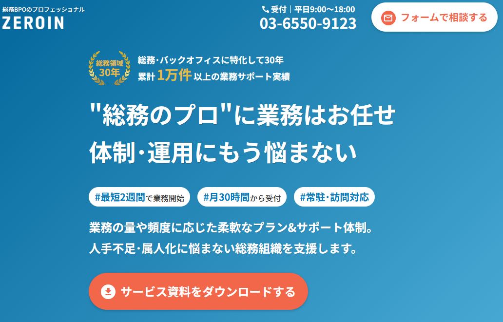| 実績 | 総務領域30年/累計1万件の業務サポート実績 |