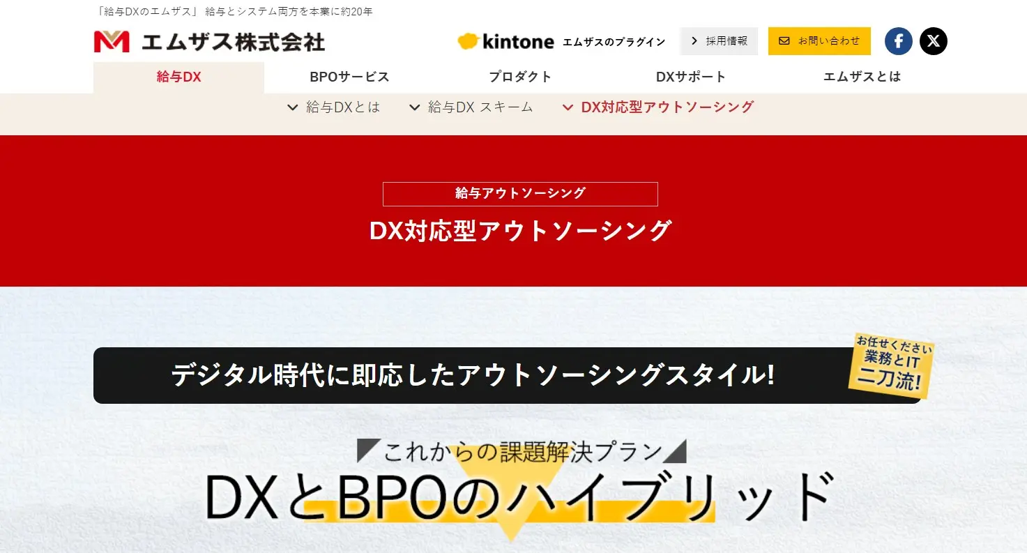 エムザス株式会社が提供している「給与DX」は、デジタルサービスとBPOをセットで提供しているDX対応型アウトソーシングです。給与計算に加え、社会保険や年末調整、住民税更新などにも対応しています。