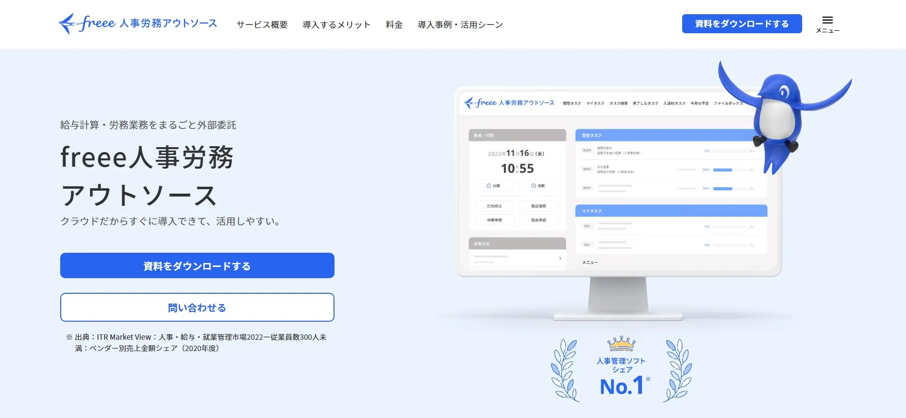 | freee人事労務アウトソース | ・自社ソフトで給与・人事情報を総合管理 ・外注から内製への引継ぎがスムーズ |
