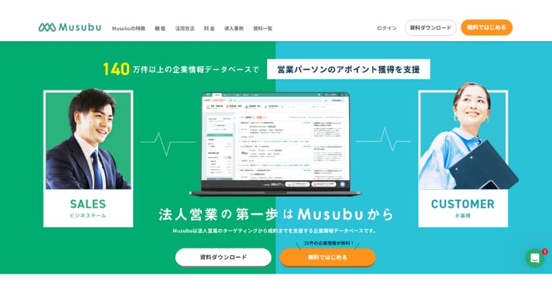 「Musubu」は、140万件以上の企業情報を保有するリスト作成ツールです。検索軸の豊富さが強みで、売上規模や従業員数、リアルタイムの求人情報など細かいターゲティングが可能です。