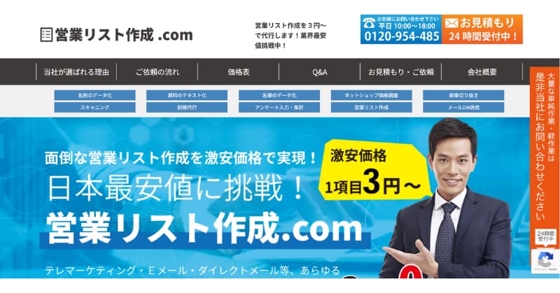 | 費用 | 基本料金:10円~/1件 ※会社名、電話番号など項目ごとに別途単価が発生 ※ミニマムチャージ(最低発注額)は30,000円 |