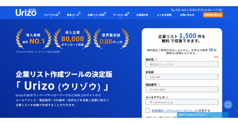 「Urizo(ウリゾウ)」は、リスト作成ツールです。iタウンページをはじめとする30以上のサイトから、メールアドレス、電話番号、FAX番号、住所などを収集し、企業リストを自動で作成します。