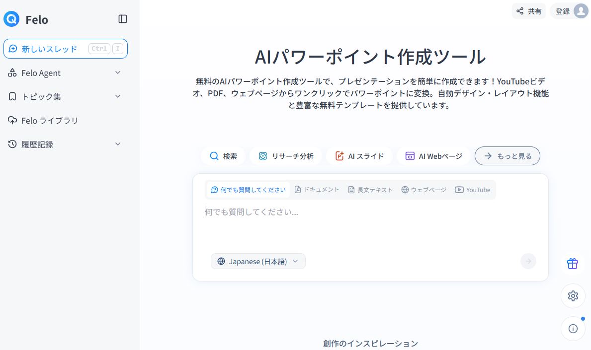 | 特徴 | ・Felo AI検索の結果を基に自動的にスライドを生成 ・目的に応じて選べる多様なテンプレートデザイン ・スマートフォンからもプレゼン資料作成が可能 |