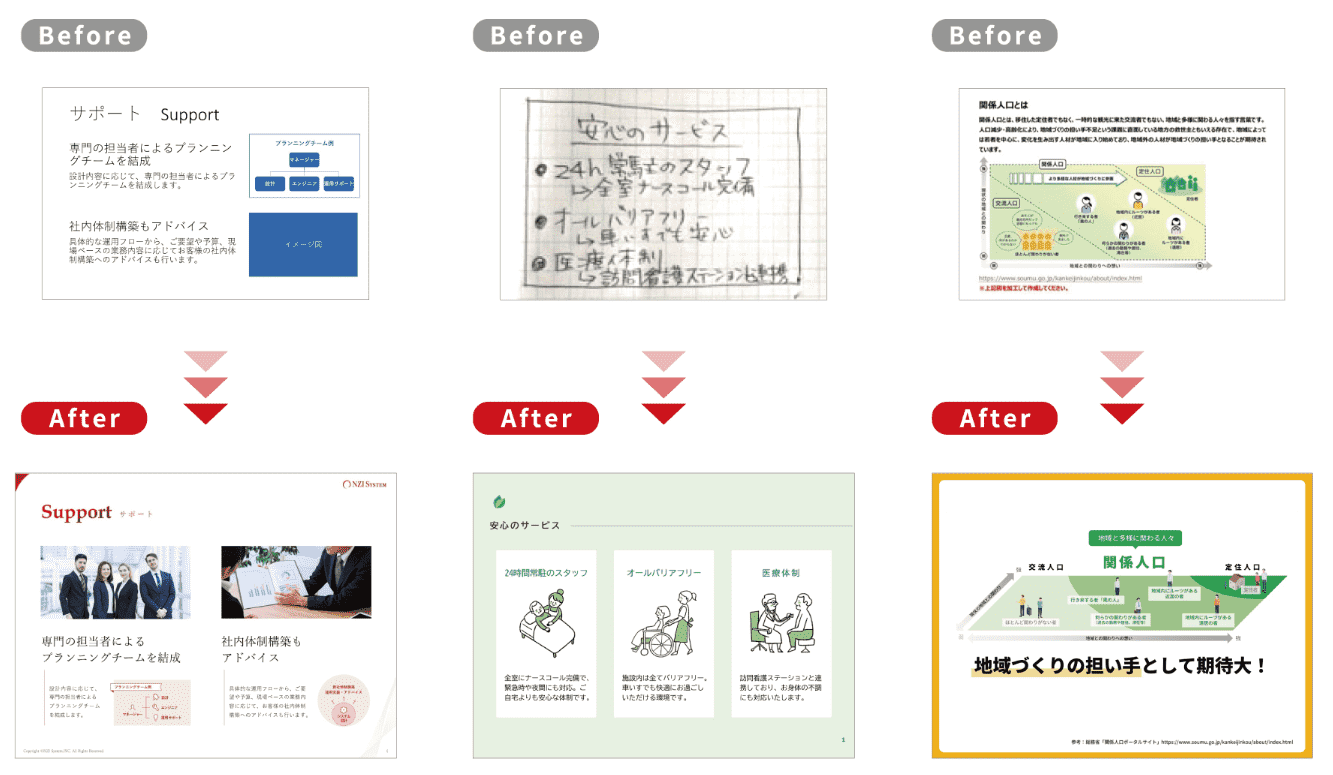 「テンプレート的で印象に残らない資料」や「AIツールでは表現しきれない細やかなニュアンス」──そんな課題を感じている方にこそ、プロの手による資料作成で違いを実感いただけます。