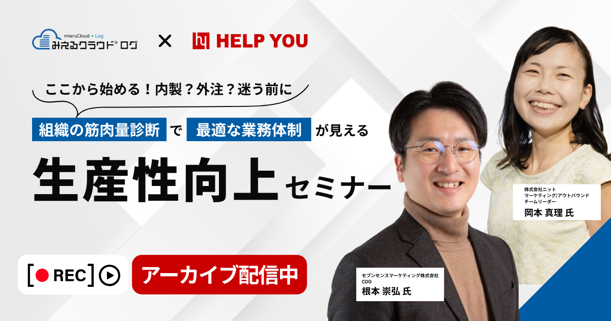 本セミナーでは、当社HELP YOUとクラウドログサービス「みえるクラウドログ」を提供するセブンセンスマーケティング社の共催で、業務可視化の最新ノウハウと人材発見・定着、内製・外注の判断の具体策を解説します。