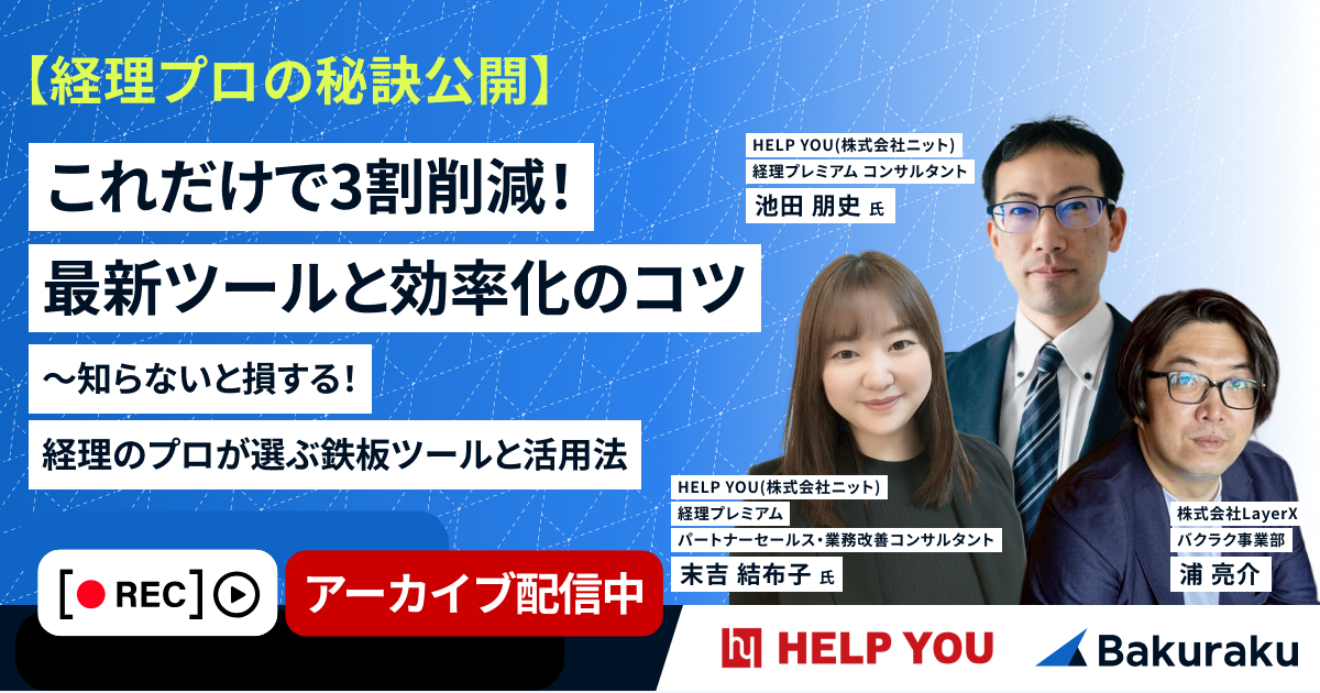 本セミナーでは、多くの企業の経理業務を改善してきたHELP YOUの経理プロ集団が、数ある会計・経理ツールの中から「実務で最も効果を発揮する」と推薦する「バクラク」を徹底解説します。導入によって、請求書処理やデータ集計の負担がどのように軽減されるのか、現場で実際に起きた変化をリアルな事例とともにご紹介。さらに、導入を成功させるための具体的なステップや活用の工夫もお伝えします。参加後には、自社に合った効率化の着眼点が明確になり、明日から活かせる実務改善のヒントが得られる内容です。